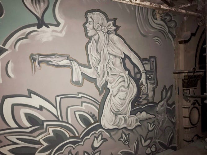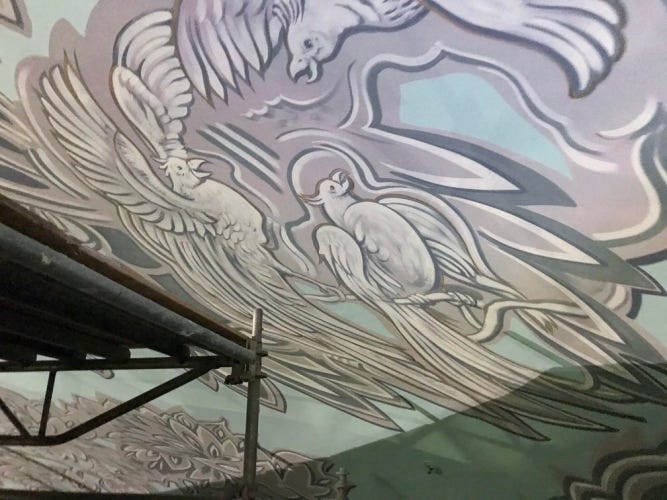 While I was there, I was told the original mural was painted by three brothers. If anybody has more information about this I would love to hear it.