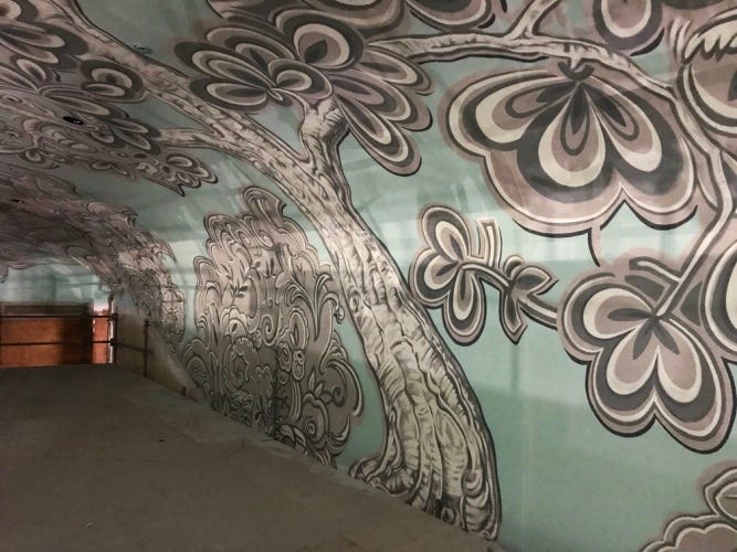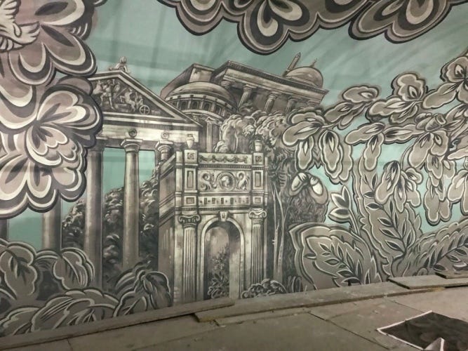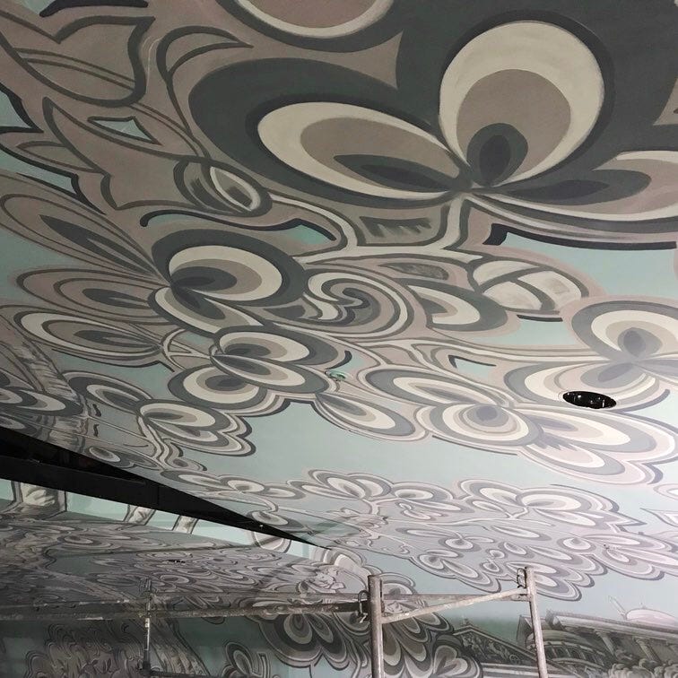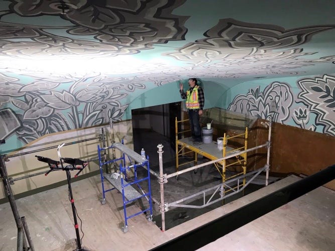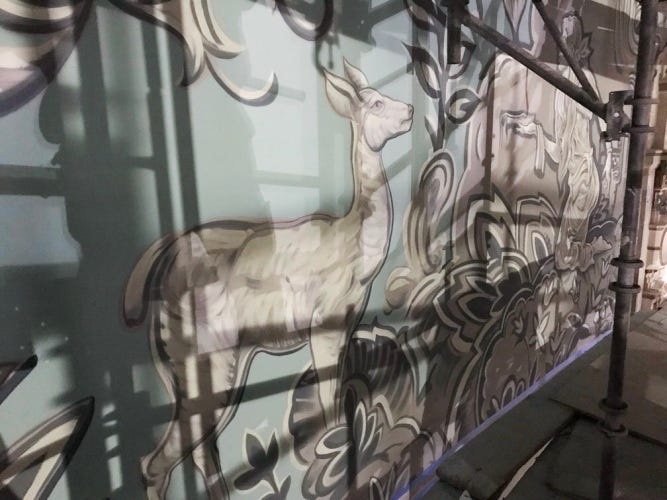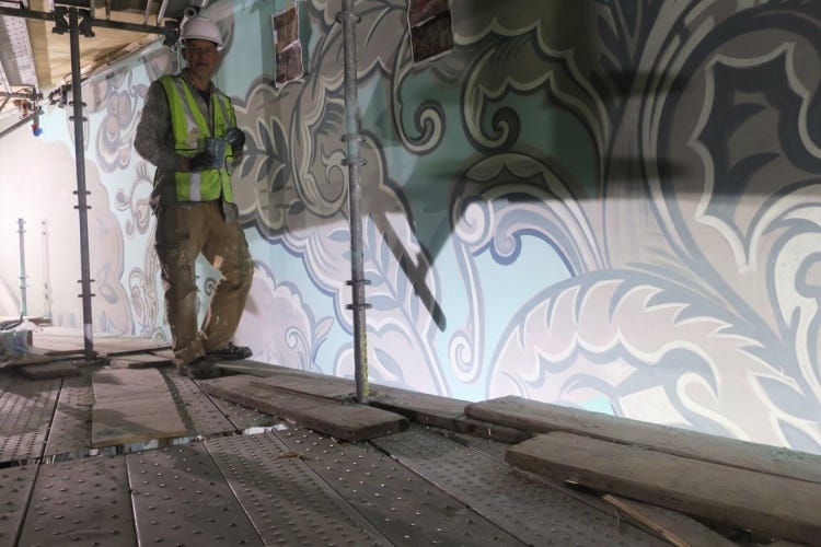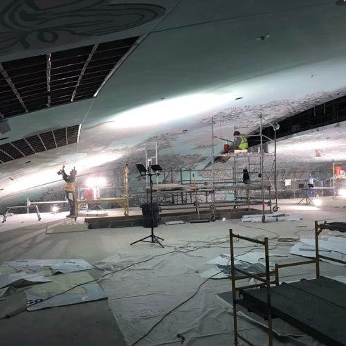 It was quite large. I’m guessing 7 or 8000 ft.² of painting. So the very first thing they did was hire a photographer to take detailed pictures of every square foot of the mural, so we would have a reference to repaint it.