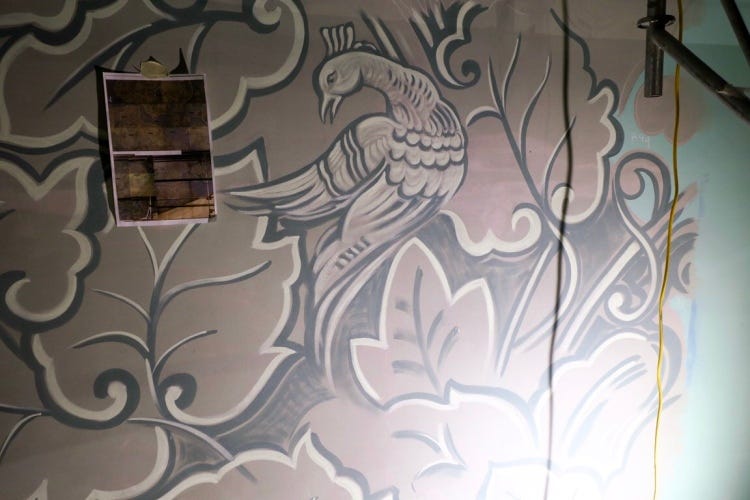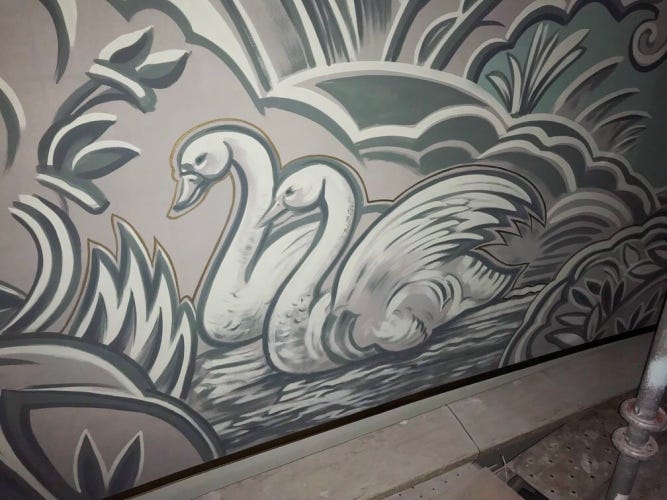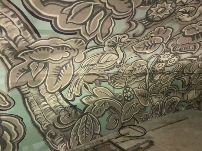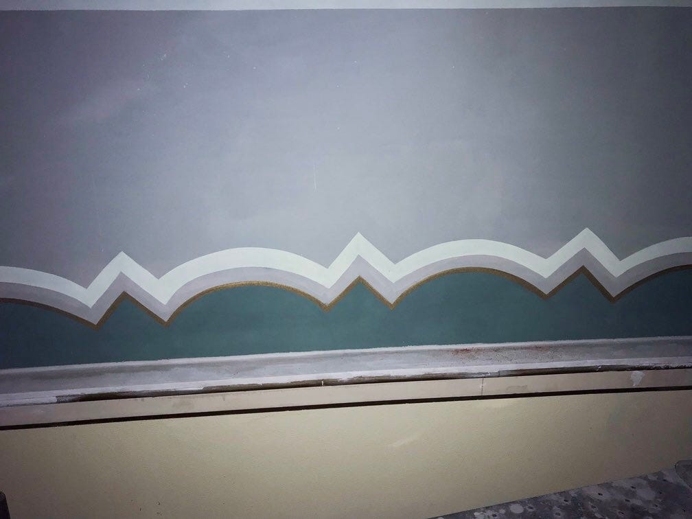 The asbestos was removed and the ceiling re-created and painted the background green. Then using enlargements of the photographs, the lines of the murals were "pounced" or transferred to the new wall.